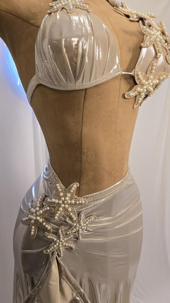 قماش سترتش اللون لماع بيج مع شغل كرستال و لولو بأشكال نجوم
